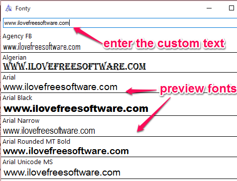 Although there are many other free font viewers already available, but this is insanely simple and lightweight software. One of its best features is that you can enter the custom text to preview the fonts. So before using a particular font for a message, you can use this tool to preview all the fonts with custom text, and then select the desired font. And it shows multiple fonts together, so you can quickly see how that custom text will look in different fonts together.