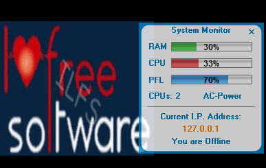 Execute the application file and its tiny interface will be in front of you. It provides a transparent interface and you can drag n drop it to any position on your desktop screen. As soon as its interface is opened, it will start its work to monitor CPU usage and RAM usage. CPU and RAM usage is monitored in percentage. Three different color bars will be visible to you for RAM usage, CPU usage, and Page File Load (PFL).
