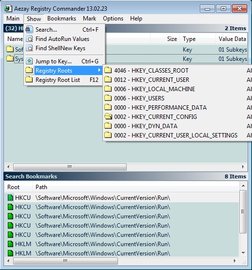 Select Show >> Registry Roots and from there browse to whichever registry key you’re interested in editing. When you find it, simple right click and from there select the course of action.