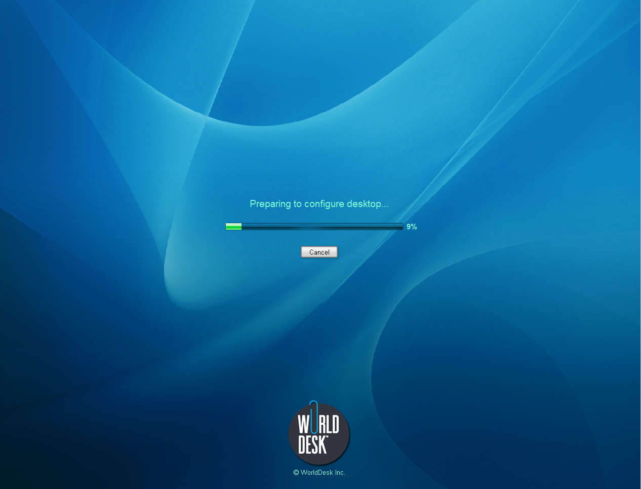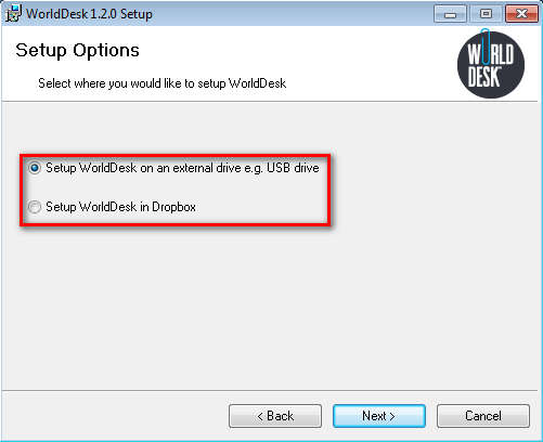 This is where you are asked where you want to install WorldDesk, you can either choose an external device like a USB thumb drive or external drive, or you can place the necessary file for the WorldDesk machine inside your DropBox account. The nessecery space for basic installation of WorldDesk would be 80 MB, but make it 100MB just in case. You’ll have to free up space if you plan on using WorldDesk. After the installation is completed, just run the desktop icon and the machine will start: