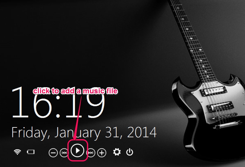 The lock screen will show you day, date, and time with default wallpaper. Its music player will remain hidden, until you click on available option. After that, you can use Play/Pause button to add a music file to play. It can play added music even if you have closed the lock screen.