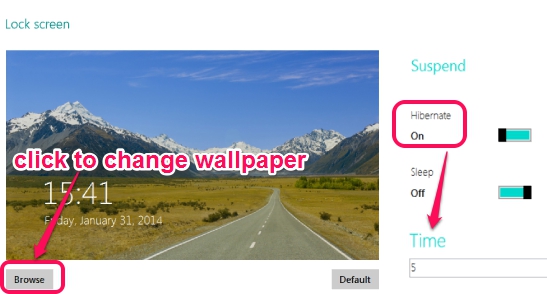 Apart from this, settings icon is available that is helpful to change the wallpaper and schedule PC hibernation mode/Sleep mode. Click on Settings icon and it shows Personalize and General options. Personalize option is used to change background wallpaper. And General option is helpful to set time (5 min, 10 min, 30 min etc.) for hibernation mode or sleep mode.