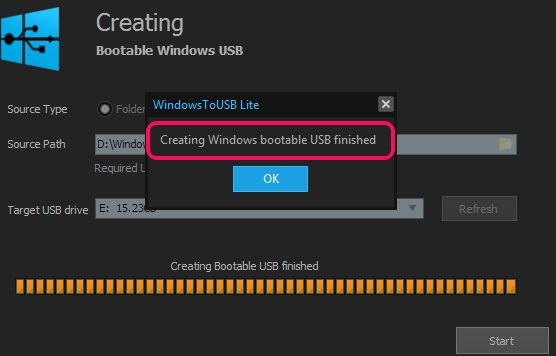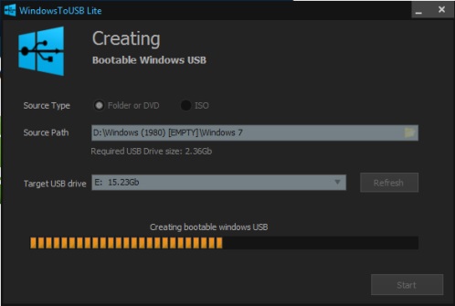 WindowsToUSB Lite is really better than many similar software because it is not limited to creating bootable USB drive only with ISO file. A folder or DVD is also supported. And it is a portable software as well, so you can keep and run it even from your pendrive.