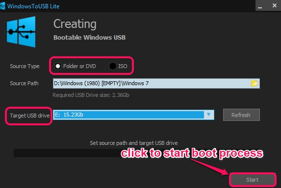 WindowsToUSB Lite is a handy free software to create bootable USB drive using folder, DVD, or ISO image file of Windows available on your PC. It provides a very simple process to create bootable flash drives, which will be helpful to install Windows, whenever needed. Just few simple steps are needed to generate bootable flash drive using this software.