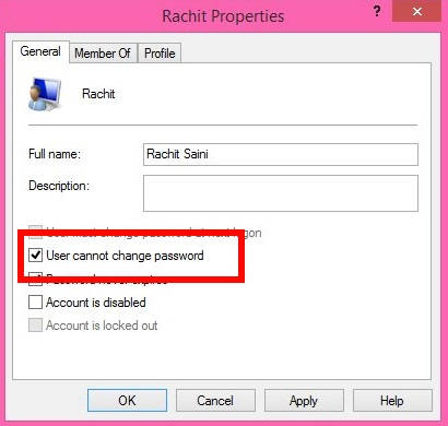 Step 4: In the Properties window of that particular user, you will find a box that says “User cannot change password”. Check this box and then click on OK. Sign out and then sign in again to apply the changes.