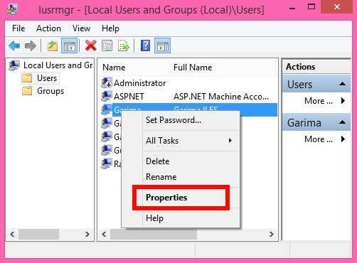 Step 3: Right click on any user, whom you want to block from changing password. From the right click menu, click on Properties. It will open basic properties of that particular user.