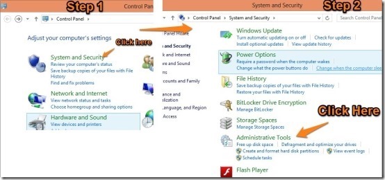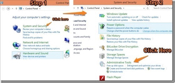 - Now that you have the control panel open, just select the System and Security option as seen in the step 1. This will bring up a list of options as shown in the step 2, just click on the Administrative Tools as shown in the screenshot below.