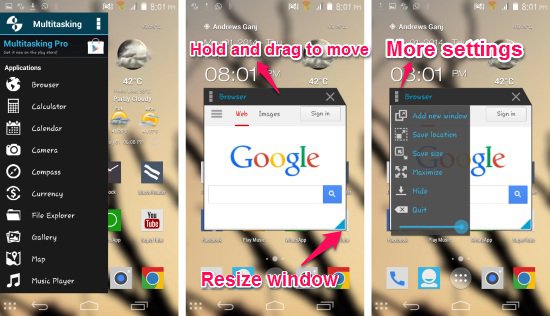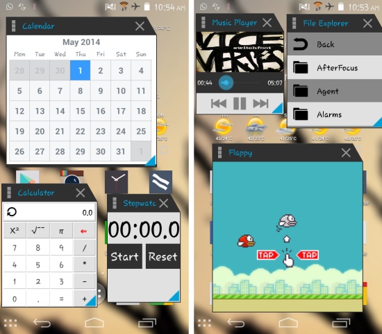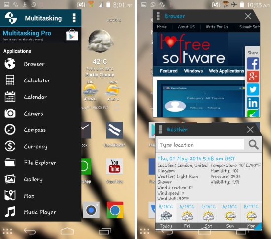 Multitasking app for Android is a free app which presents you with a suite of floating apps for Android. These apps float over the screen and they are resizable and movable. Multitasking app keeps running in the background and provides you with a sidebar which you can use to launch the floating apps. Also each of the included apps can be used in full screen mode. In this app you get floating apps like calculator, maps, file explorer, camera, music player, voice recorder, calendar, and more. By using this app, you can use your Android device to multitask with ease and you don’t have to keep switching between windows.