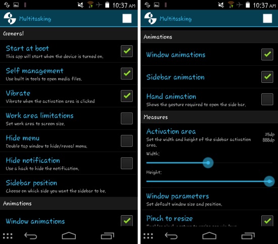 You can get Multitasking app from the link or QR code provided at the end of this review. After installation, launch the app and you will have the settings page in front of you with a short tutorial as seen here. You can start and stop the app by using the start/stop button. When multitasking is running, it will show a notification on top. To bring up the sidebar, simply swipe from the left edge to right.