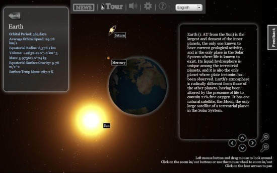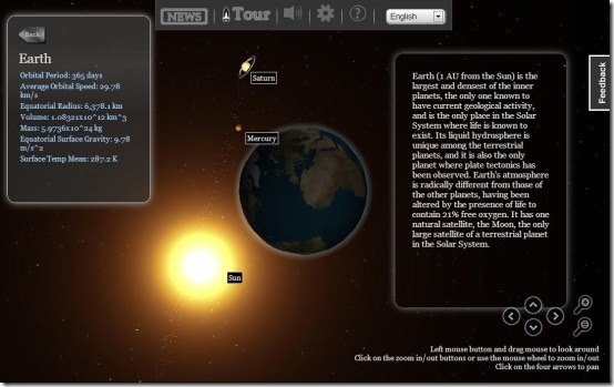 Suriyan is another free planetarium app for Chrome that gives you a 3D view of the solar system through which you can explore solar system. This free planetarium app offers you simple interface in which you can see all the planets rotating around the sun. At the top, it displays the list of the 9 planets, which you can select according to your desire. This app simply displays the planets but does not display any details realted to the planet, which seems to be the biggest drawback of this free planetarium app.