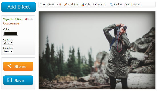 To add vignette effect here, first, upload your photo and then click Add Effect button to browse the Vignette Effect. Or you can use this direct URL to Tuxpi’s Vignette Effect. Once you add the effect, you can tune it as per your needs. Here, you can change the vignette color and adjust its opacity along with fade in level. You can experiment with these options to get a good vignette effect. After that, you can save your photo to your local storage. You also get an option to share it on social media as well.