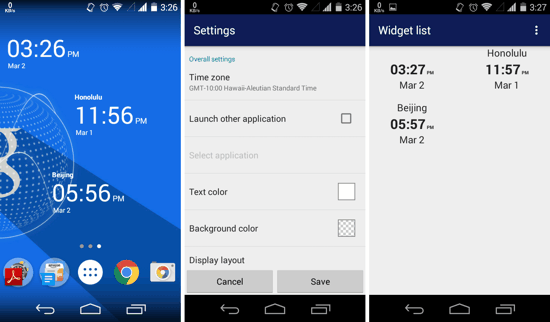 Simple Clock Widget is exactly what you must have figured out from its name — a simple World Clock Widget which shows you the time for different cities. There is no main app interface, and all you really do is add the widgets, and select different cities. You can add as many widgets as you want, and all of them are of the same size. Try it out if you are looking for some bare-bones stuff.