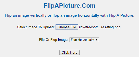 FlipAPicture.Com is a very simple website to flip images. Only one image can be flipped at a time and this feature works very well. It doesn’t mention any size limit for the input image. Once you have added the image, you can select the option to flip horizontally or vertically. Finally, use “Click Here” button. It will upload the image and flip it to the selected option.