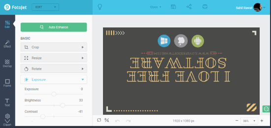 When the output is ready, you can save the image to PC as JPG or PNG with a custom name. Apart from that, it also comes with effects, overlay, frame, text, and other features in the free plan. So, the website is quite good to flip images online as well as enhance the images.
