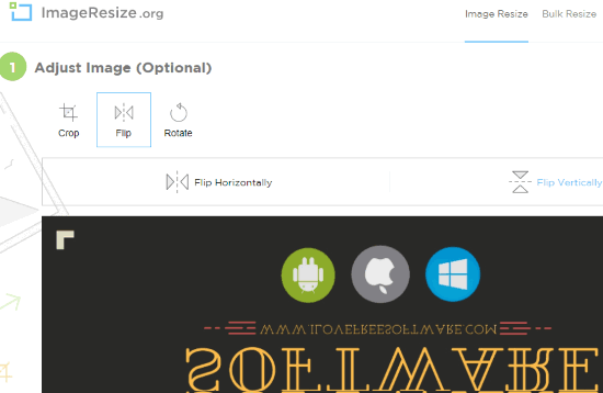 ImageResize.org is another simple website which lets you flip PNG and JPG images. I like its clutter-free interface. You can preview the input image, then flip it horizontally or vertically, preview the output and then save the output flipped image. The flipped image can be saved as PNG or JPG or in original size.