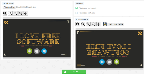 Pinetools.com provides a very good tool to flip images online. It has three interesting features that I like a lot. You can use this tool to flip the image horizontally or vertically or both ways. Apart from that, you can also preview the input image and flipped image side by side to have a better look at the output.