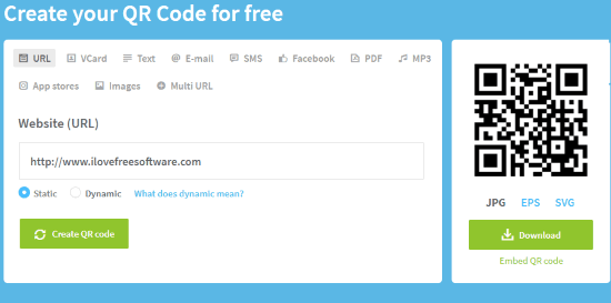 QR Code Generator (Homepage) is also a very good URL to QR code generator website. It comes with the feature to set background and foreground colors, set border width (0-10), error correction level (Large, Medium, High, etc.), and size for output QR code. After that, you can save your QR code as SVG, PNG, JPG, or EPS file. While adjusting options for QR code, you can also preview it, which is very helpful to see how your QR code looks. You can also create QR code for storing some text, phone number, geolocation, SMS, event, email, vCard, and more. All your QR code data remains encrypted and not stored on the server.