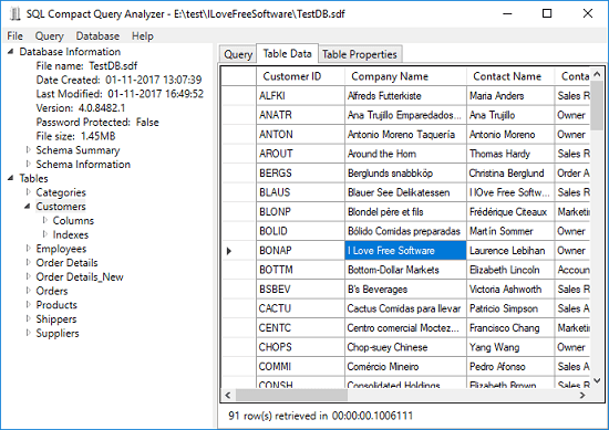 It’s quite simple to open, view, and edit SDF file using this free software, Compact View. Open the software and open the SDF database file you wish to see in it. And before opening it, you can specify whether you want to open the database in read only mode or in edit mode. After it opens your database, you can browse it and do whatever you want. There is a SQL editor given in the software that you can use to manage the database tables and data in them.