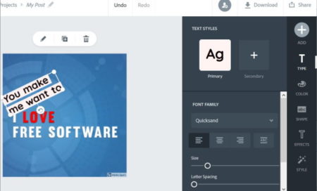 This article covers 6 free websites which let you create graphics from text. These websites can be used to create beautiful and professional looking graphics for multiple purposes like graphics for your social media channels, graphics for newsletters, etc. All these websites offer free templates which can be used and you can enter text on them. Then the text you entered can be made stylish using various options. Once you are done creating your graphic, you can download it to your computer in formats like JPG, PNG, PDF, etc.