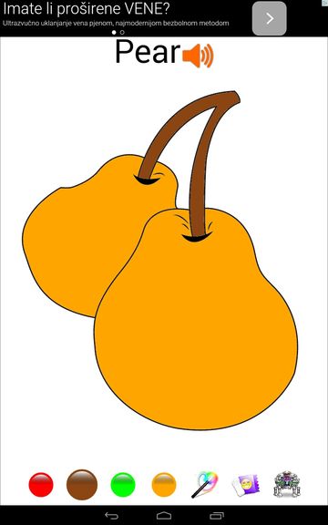 Menu has 4 quick access colors, but tapping on the paint brush icon activates a more advanced color palette. Last icon is for exporting finished creations (to gallery or directly to social networks) and the one before that is for switching to a different coloring page. At the very top you have the name of the fruit written and a speaker icon which, once tapped, reads out the fruit name (so the kids can learn more easily).