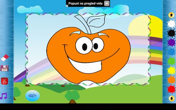 As you can see from the image above, this app has a bit more simplistic interface, but everything is still there, color palette down below, menu at the top and coloring page in the middle. Fruit used for coloring is selected at app launch, the menu that shows up.
