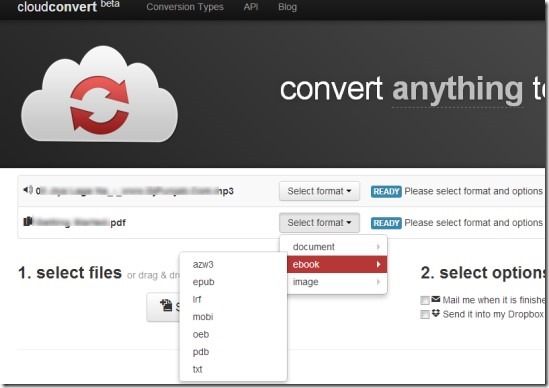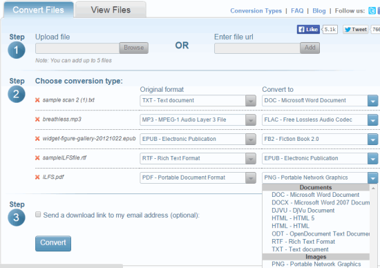 It also comes with features to upload files from Dropbox and Google Drive and send the output files to these cloud storage services. Other interesting features of this website are: sending links of output files to desired email address, inserting URLs of different online files for conversion, converting different file types together, etc. Unfortunately, video conversion is not possible through this website, but still, it is a handy file conversion website.