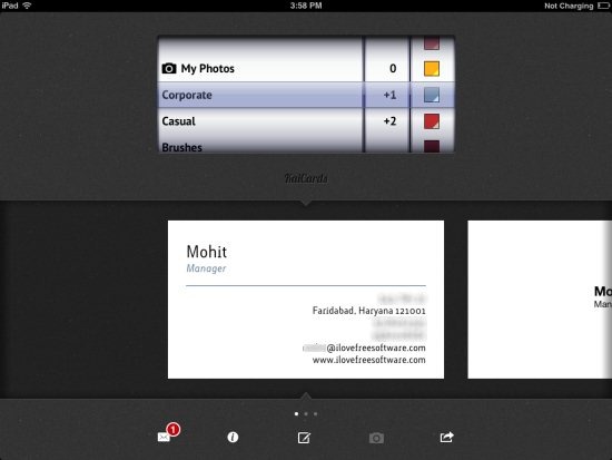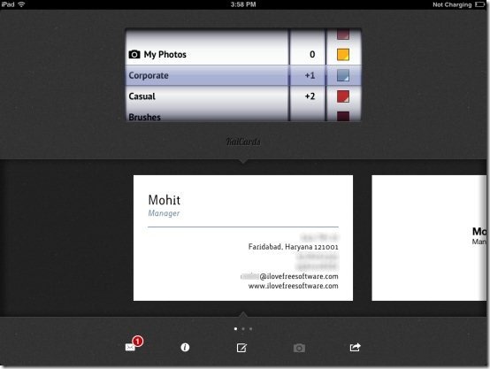 This iPad business card maker app lets you pick business card layout from multiple categories. Categories in the app include corporate, casual, brushes, rough, nature, and winter. Each category in the app contains 3 business card layouts. On top of all these, the app also allows you to embed your favorite image in the background of the business card. This makes the business card look more real with the image or logo of your corporation.