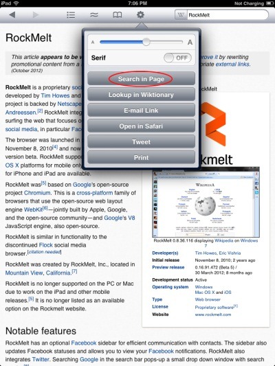 This Wikipedia app for iPad lets you search any word in the article which you are reading on your iPad via Wikipanion app. Just tap on the settings button and then tap on “search in page” button from the settings menu of the app. Now start searching any word in the article from Wikipedia.