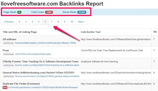 On top there’s a bar showing your site’s PageRank, Total Links, and AlexaRank. Below this bar, you can see a list of all webpages that contains your inbound links, their Anchor Text, DoFollow/NoFollow tag info, and corresponding PageRank. You can use the numbers present at the top to move to other pages in the backlinks report; where a single page consists of information on around 20 links.