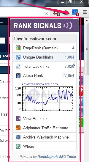 This option lets you quickly see the PageRank, Unique Backlinks, Total Backlinks, Alexa Rank, estimated traffic, domain name info, and other SEO metrics for any web page that you visit on your Chrome browser.