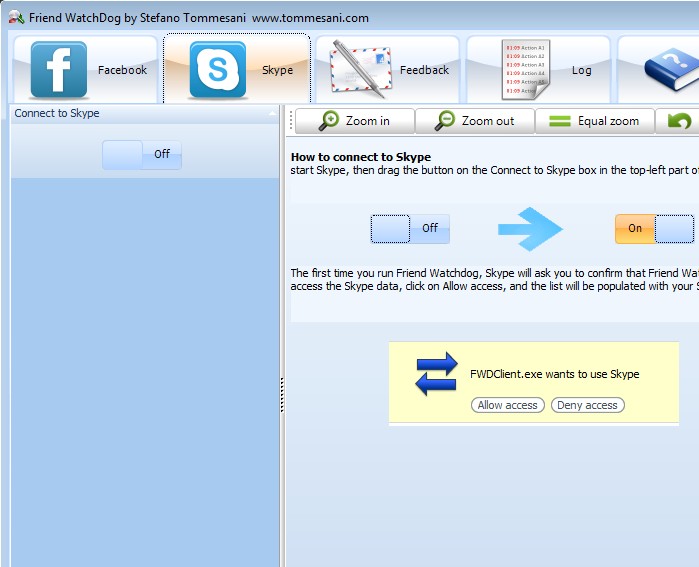 Skype has to be installed and running if you want to connect to it. Move the Off button to On once that Skype is up and running. If it’s your first time, you’re gonna have to allow Friend Watchdog access to your account. List of friends and contact activity charts should appear on the right, just like the one that Facebook has.