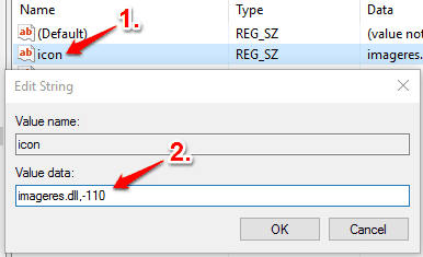 - icon: Under icon string value, set value data “imageres.dll,-100” and save the changes. This is used to show the display icon.