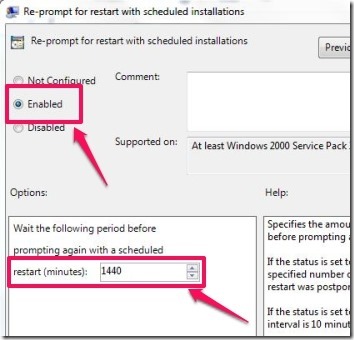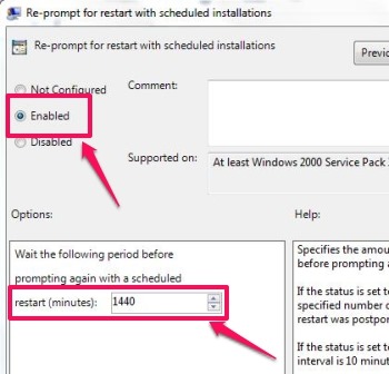 Then you need to Enable and assign the re-prompt duration in minutes (maximum minutes which can be set is 1440, or 24 hours).The best part of this feature is that, after completing the duration of 24 hours, you’ll be prompted to restart now or later. If you wish to click later, it will not ask you to restart until your have left your computer on for next 24 hours.