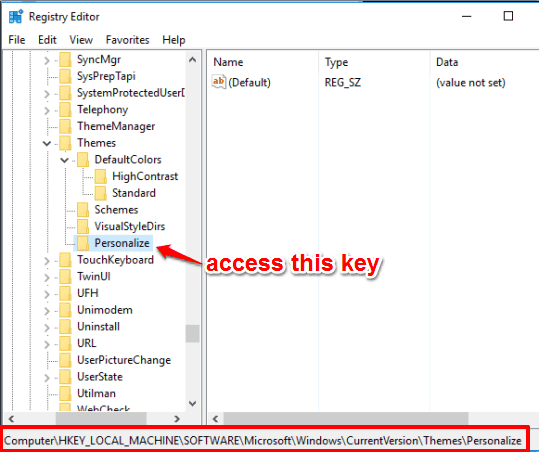 Step 1: Open Registry Editor window and access Personalize key under HKEY_LOCAL_MACHINE: HKEY_LOCAL_MACHINE\SOFTWARE\Microsoft\Windows\CurrentVersion\Themes\Personalize