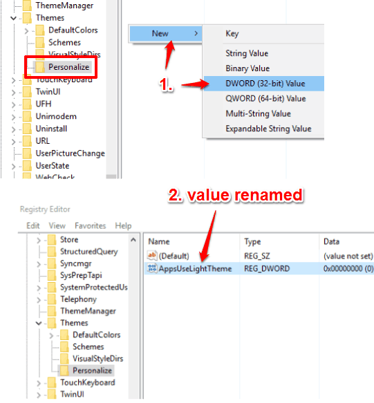 Step 2: In Personalize key, a new DWORD value needs to be created (right-click → New → DWORD (32-bit) Value) and rename it to “AppsUseLightTheme.