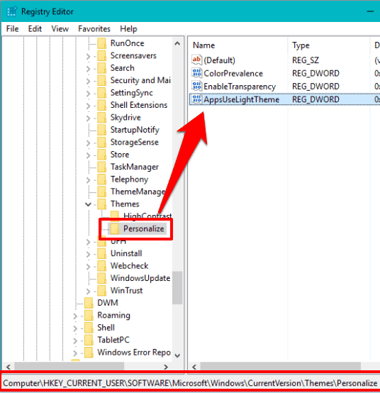 Step 3: Create the same AppsUseLightTheme value in Personalize key but under HKEY_CURRENT_USER.