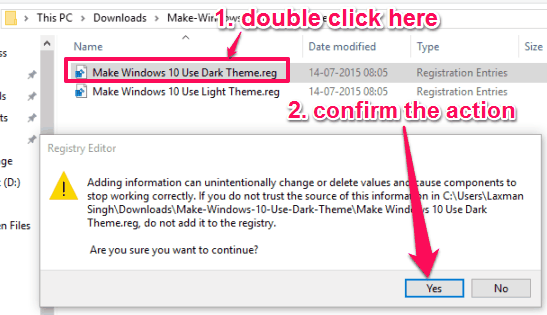 Extract the zip file and double-click on dark theme reg file. It will add keys and values for the dark theme in the Registry Editor. Before doing so, it shows a confirmation message. You can press Yes to confirm the message and dark theme will be applied immediately.