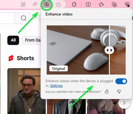 Enhance is a very nice addition to the feature set of Microsoft Edge browser. It does help in boosting the quality of online videos such as on YouTube. It helps you watch online videos clearer and more vibrant using vivid mode, or, with compatible hardware, you can increase your video quality even with AI-powered super resolution mode.