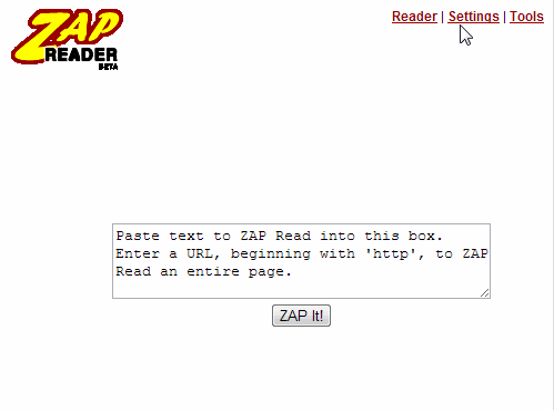 Zapreader.com is another free online service which is used to learn speed reading. It offers you setting options which you can use to customize wpm, words at a time, font, alignment, font size, font color, background color, etc. It also provides you auto-play options which you can use accordingly. It provides you the text box where you need to paste the desired text content and hit ZAP It! button to begin. Then you need to hit play button and start reading practice accordingly. It provides you keyboard shortcuts as well so as to control the reading session accordingly.