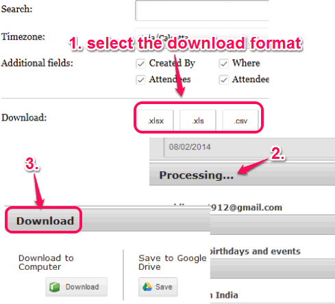 Step 4: This is the last step in which you have to select the output format for downloading your calendar’s list. Xls, xlsx, and csv format is available to choose from.