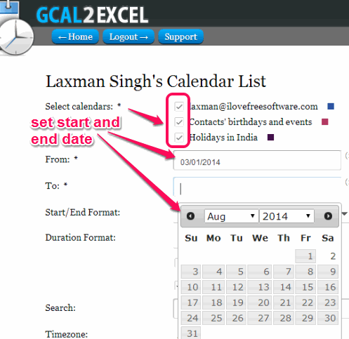 Gcal2Export is a free online application that helps to export Google calendar to excel. It lets you export your events or meetings list, birthdays list, and holidays list to PC for offline viewing. List can be exported as csv file, xls, or xlsx file. Apart from this main task, you can also export additional fields, such as: meeting place, attendees, and total number of attendees that need to come to attend meeting.
