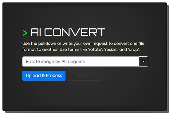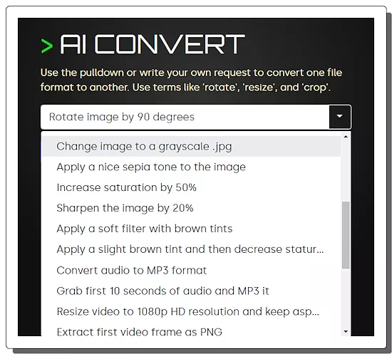The tool has a text field alongside a pulldown menu. This pulldown contains all the operations that you can perform with this tool. You can use the pulldown or write your request to convert one file format to another. You can use terms like ‘rotate’, ‘resize’, and ‘crop’. The tool also supports additional commands that you can use with the primary operation. For example, you can ask it to “Resize video to 1080p HD resolution and keep aspect ratio”.