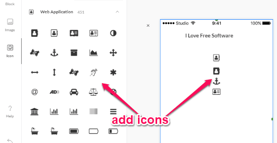 STUDIO is a free online mockup design creator for iPhone apps and websites. Using this website, you will be able to easily create stunning mockups for your iPhone app or website and see a live preview of the designs. To create a mockup design, you have to first choose between iPhone app and website for the project. Then you can go ahead and add predefined blocks, images, and icons. The predefined blocks include UI Kits (boxes, text, icons, etc.), Studio Style Designs, Material Designs, and iOS UI Designs. You can add these elements to a mockup design by simply dragging and dropping them.