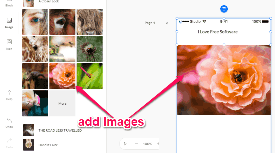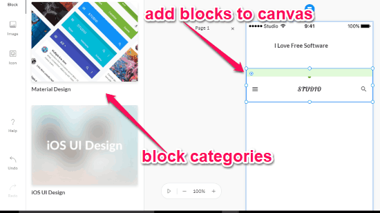 Apart from that, you will also see three different block categories named, Studio Style, Material Design, and iOS UI Design. You can explore these categories and add the predefined block elements to your design by dragging and dropping.