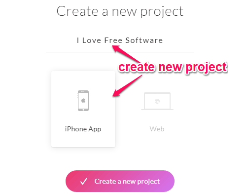 After you visit the homepage of STUDIO, simply create a new account to proceed for creating mockup designs. Now, on the “Project” tab, click on the “Add New Project” button to create a new mockup design project. When you do that, it will ask you to enter the project name and choose the mockup type either as iPhone App or Web.