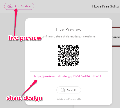 When you’re done with the mockup design, you can go ahead and click on the “Live Preview” button to see how the design looks like in action. Apart from previewing the design, you will also get a sharing URL and QR code to share the design with others to see.