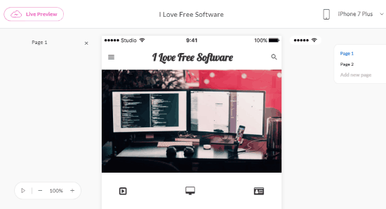 STUDIO is a very useful online mockup design creator which helps you create stunning mockups for your website and Phone app. You can create mockups with as many pages as you want with custom designs. Personally, I like it as the database contains tons of predefined blocks, images, and icons for you to use for free.