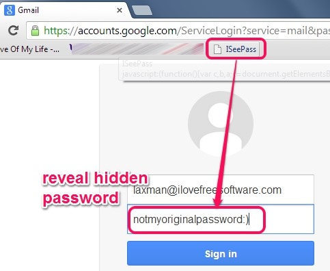 ISeePass is a handy bookmarklet in this list that supports most of the modern browsers (Internet Explorer, Opera, Firefox, Google Chrome etc.) to reveal the password. All you have to do is first activate the bookmarks bar of your web browser (if not already). After this, drag the bookmarklet button and drop it on bookmarks bar. Now when you want to see the hidden password, give a tap on the bookmarklet. It will immediately show you the password. Even if your mouse cursor is not in the password field, it will reveal the password. To hide the password, click the bookmarklet again.