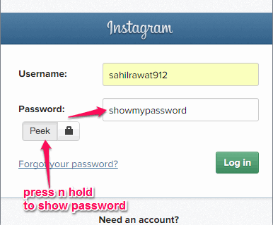 Password Peek is also a Google Chrome extension. After installation, you will find Peek button near the password field. You can press and hold that button to view the password. A lock icon is also available just next to Peek button. Clicking on that icon will always show the password. Whenever you have to hide the password, disable that icon by pressing it again.