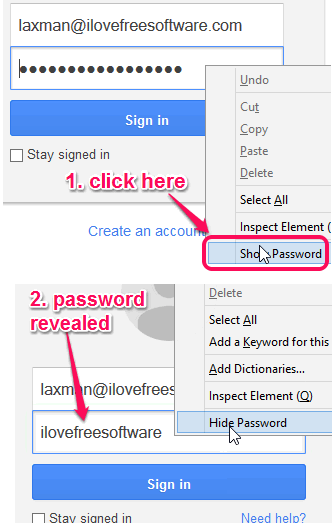 Unmask  is a very handy Firefox add-on to show and hide passwords using right-click context menu options. It doesn’t provide any button or extension icon to reveal and hide your password. After installation, it provides Show Password/Hide Password option. You simply need to right-click on the password field and select the option to see the actual password.